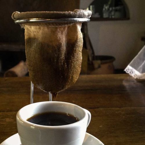 Traditionally, it is brewed in a sock-shaped cloth filter directly in water, also popular in Central and Latin America. It can be found at rustic restaurants or at street-side stalls.
